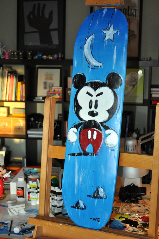 Additional Angry Mickey board titled “Mickey at Night” painted after the original three angry Mickey boards were sold during the first hour of the Festival of the Masters show in November of 2009, it sold at the Festival in 2010 AND The official Yellow Shoes board painted for Joe S. on his 30th anniversary with the company.
