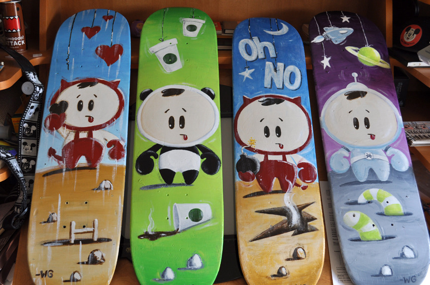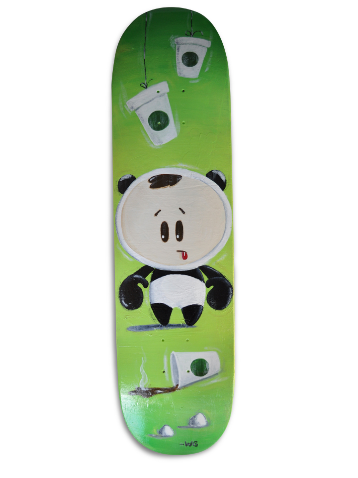 “Too many coffee cups” 8″ x 32″ Acrylic on recycled skateboard deck All the OhNo decks Share this:TweetLike Loading... Related