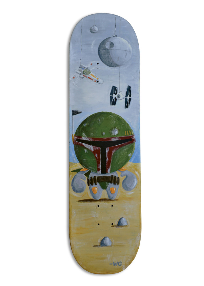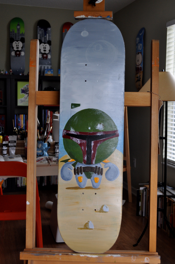 For my latest skateboard painting I was inspired by a really cool kid named Noah. He is fighting cancer and has a Medulloblastoma (malignant brain tumor) and is the bravest little guy I have ever seen. He really loves Star Wars and his favorite character is Boba Fett. Because I was so inspired by Noah and his courage, I set out to paint him a board. I wanted it to be a mash-up of one of my characters (OhNO) and his favorite Boba Fett. So the Jedi Noah board was born. I can only hope this board may have some sort of special force too that will help Noah in his fight. May the force be with you Noah!
