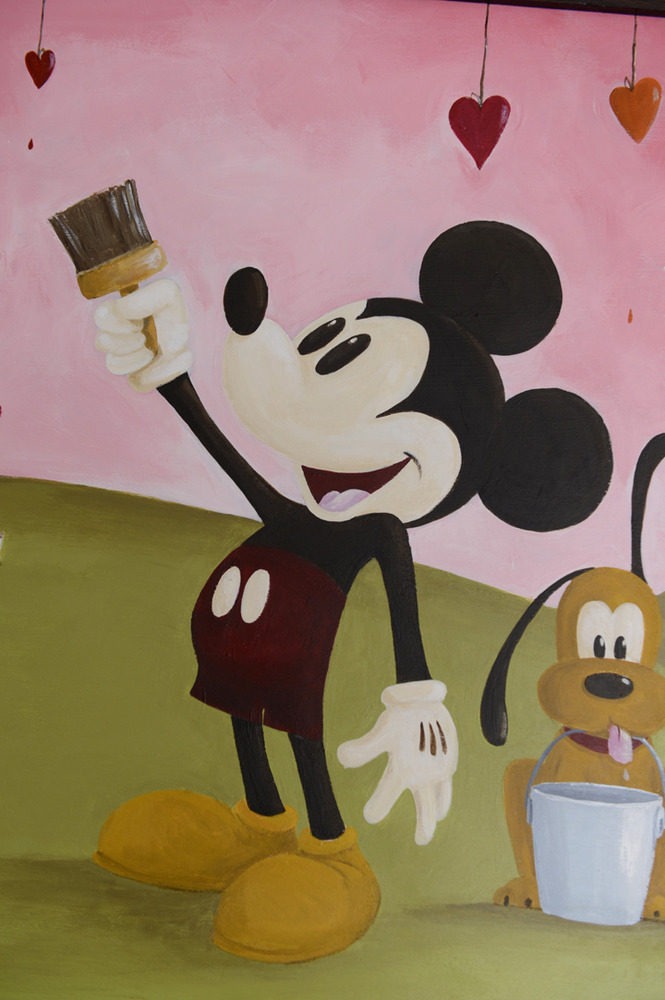 SOLD. Acrylic on Birch Wood (4ft x 2 ft.) Done for the Festival of the Masters show at Downtown Disney 2012. Mickey and his pal Pluto have found the magical land of paint dripping hearts and are busy collecting paint to color their world. ©Disney Will Gay 2012