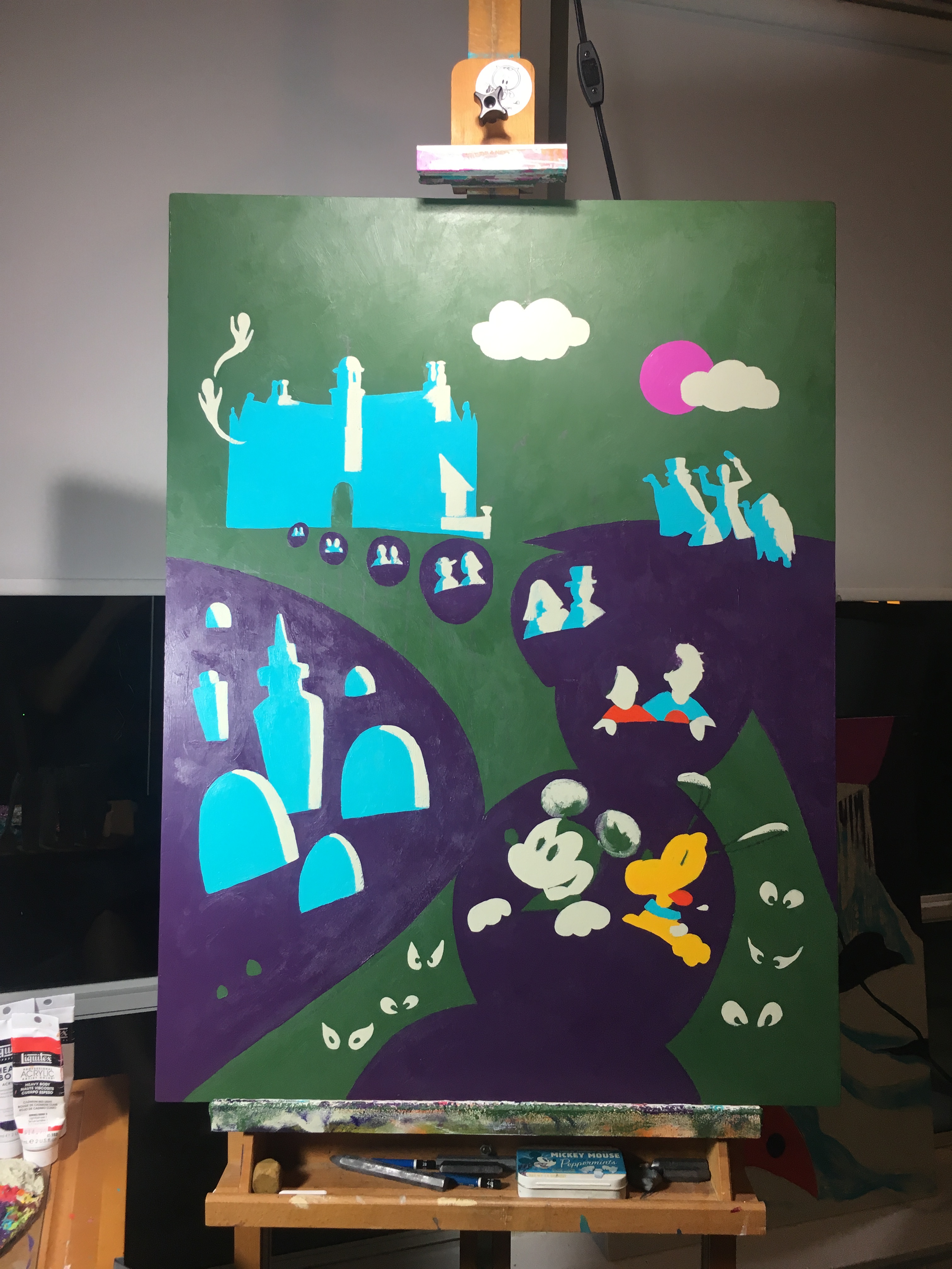 The Haunted Mansion is one of my all time favorite dark rides at both Disneyland and Walt Disney World. I have been wanting to do a painting based on the classic attraction for quite some time now. Here is a look at the painting in progress on my easel from my home studio where I mainly paint at nights. The colors were chosen to mirror the color scheme of the attraction. The are a few hidden meanings in the painting. There are the two boys behind Mickey and Pluto -those are my two sons. They love Haunted Mansion as well, and they show up in many of my paintings if you look closely. I am also in this one. Then, if you look even a little closer to the bride and her new groom in one of the doom buggies, you will notice she has an axe hidden behind her. There are also some details hidden in the tombstones that are a nod to tombstones at the park as well as some of the imagineers behind this attractions.