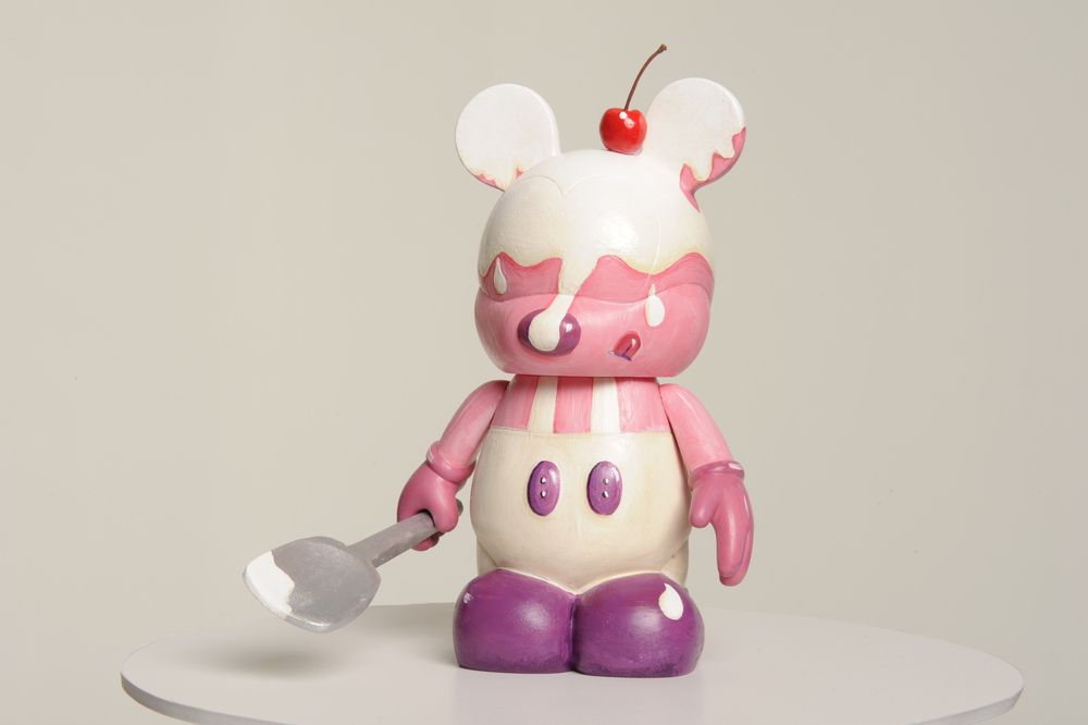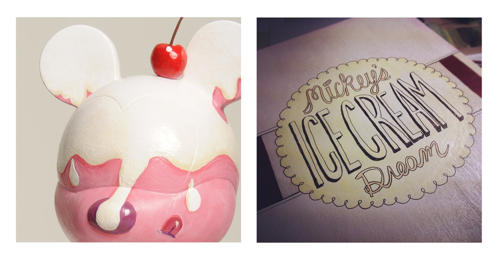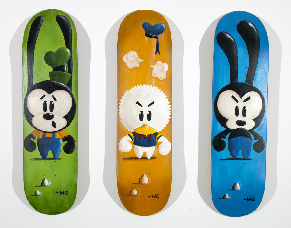 Done for a co-worker leaving Disney who hooked me up with tons of used decks to paint on when I ran out of my own. His name is Denny but everyone calls him Danny as a joke -hence the Danny on the worn out ears. This is a vintage Powell Peralta ripper deck that one was one of Denny’s first decks back in the day. I knew from the begining didn’t want to paint over it completely, so I let the areas that would have been dark on Mickey just be the original graphic of the board -scratches and all!